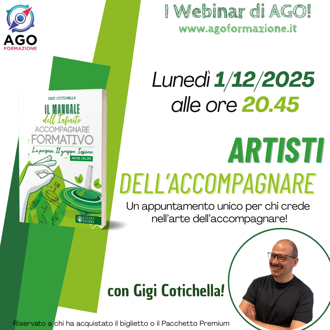 Il webinar sarà riservato unicamente a chi ha acquistato il Pacchetto Premium del libro “Il manuale dell’infinito accompagnare formativo” e ai possessori di questo biglietto.